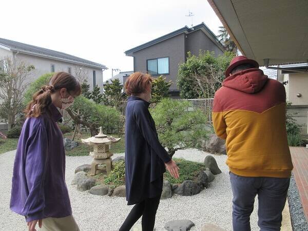 「どうぞお入りください。」と招かれて細かな砂利道を歩くふたり。ここはご自宅のお庭との
