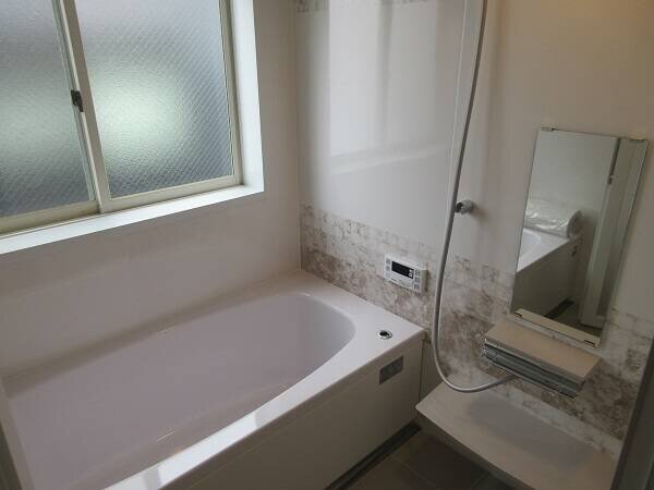 ・・・はい、窓付きの浴槽です。清潔感のある白が基調でいいですね。