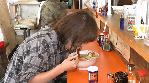 麺に卵を絡めていただくホシノさん。気になるお味は?